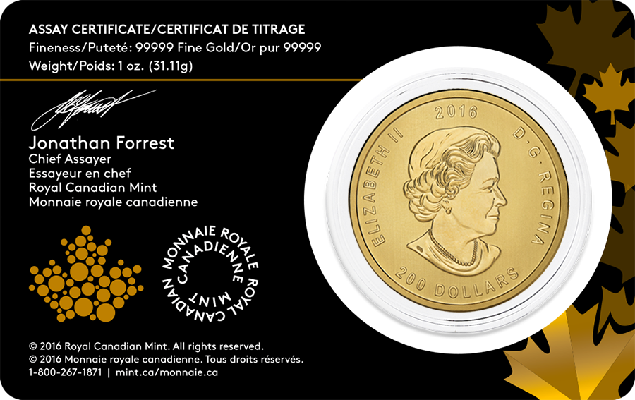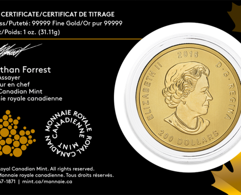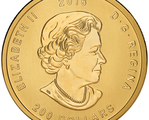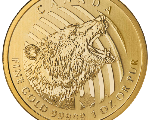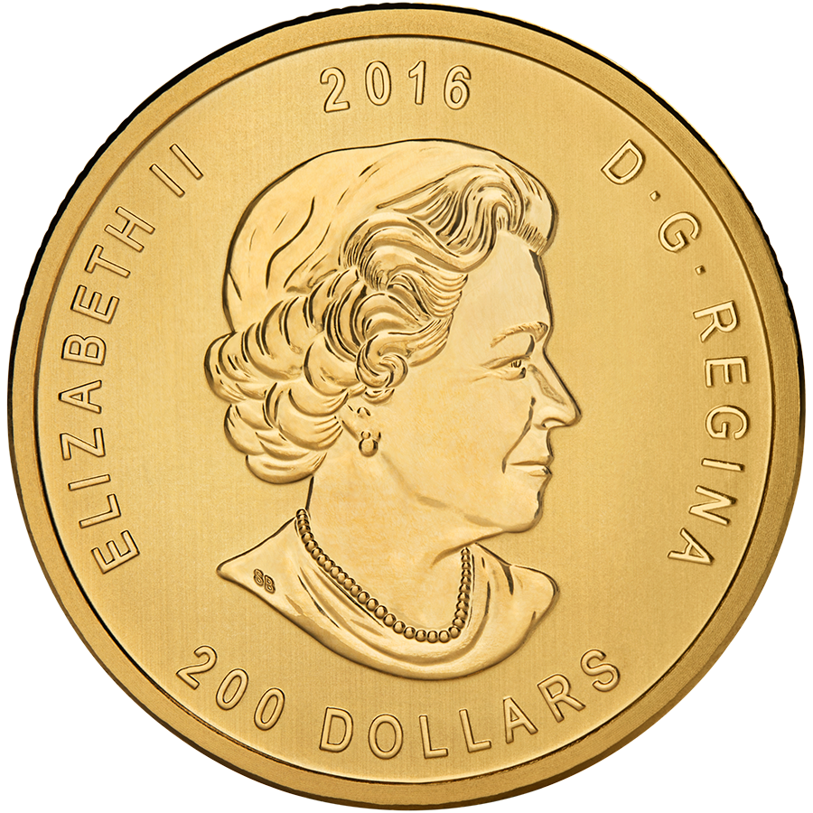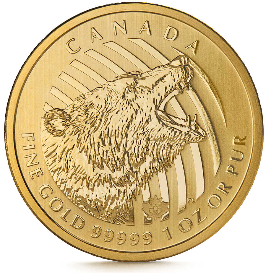 The third coin in the “Call of the Wild” 3-coin series presents a profile portrait of a grizzly bear growling. The Royal Canadian Mint engravers have lent additional beauty to Pierre Leduc’s artistry; the finishes on this coin really emphasize the dense fur, presented in full detail, bringing the intensity of the moment fully to life. The face of the coin features Elisabeth II, as do all Commonwealth coins. This limited-release collectible bullion coin contains 1 Ounce .99999 Pure gold and has a Nominal face value of $200. The coin comes packaged in an assay card, and is being minted in a limited run in 2016.